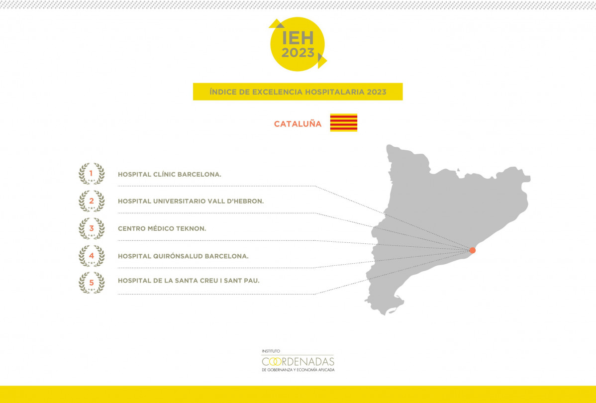 Respecto al IEH General, Catalunya tiene 4 centros entre los 10 primeros: Hospital Clínic (4), Hospital Vall d'Hebron (5), Centro Médico Teknon (9) y Hospital Quirónsalud Barcelona (10).