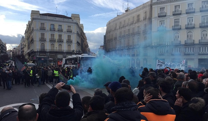 Frente a la Real Casa de Correos, la multitud que se ha acercado hasta el kilómetro cero han clamado contra la postura de la Comunidad de Madrid en la negociación con gritos de "PP y VTC, la misma mierda es" o "Manos arriba, esto es un atraco".