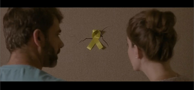En este último caso, una mujer pregunta a un hombre por qué ha colocado un lazo amarillo encima de la grieta, a lo que él responde: "He visto por la tele que estos lazos amarillos pueden tapar cualquier problema".