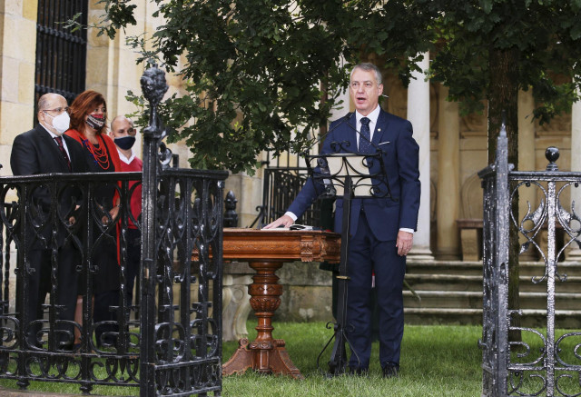 El lehendakari ha tomado posesión de su cargo por tercera vez consecutiva este sábado en el hemiciclo de la Casa de Juntas de Gernika, donde, emocionado, ha asegurado que, "por voluntad del Parlamento Vasco", asume la Lehendakaritza, que cumplirá "con lealtad a la Corona y respeto a la Constitución, al Estatuto de Autonomía de Gernika y demás leyes vigentes".