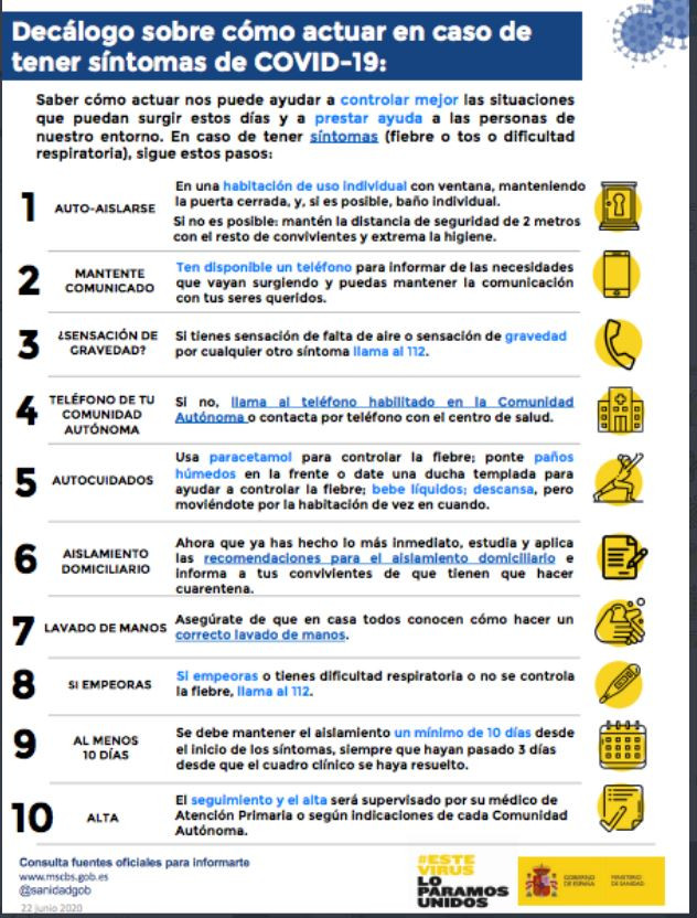 Dada las nulas medidas de autoprotección de Pablo Iglesias y su lista electoral y para todo aquel que se contagie durante esta semana santa el Ministerio de Sanidad ha emitido un Decálogo sobre cómo actuar en caso de presentar síntomas Covid-19. Podemos Madrid en campaña electoral es el claro ejemplo de lo que hay que evitar en una pandemia con tanta tasa de contagio, distintas cepas y alta mortalidad y en pleno proceso de vacunación social.
