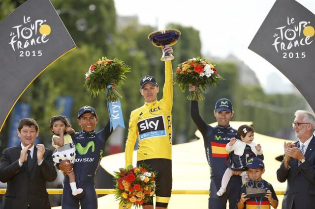 En los casi dos kilómetros que comunican el Arco del Triunfo y la Plaza de la Concordia, el colombiano Nairo Quintana y el español Alejandro Valverde, ambos de un Movistar Team que se ha proclamado vencedor en la clasificación general por equipos por delante de Team Sky y Tinkoff-Saxo, escoltaron al ganador del Tour en el podio final de París.