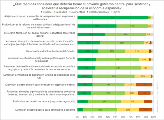 Para el 92% de los directivos españoles la medida más urgente a tomar por el próximo gobierno en pos de consolidar la recuperación económica debería ser la lucha contra la corrupción y el aumento de la transparencia en empresas e instituciones, muy por delante del cumplimiento de los objetivos de déficit, ni la flexibilización del mercado laboral, ni la reforma territorial del estado.