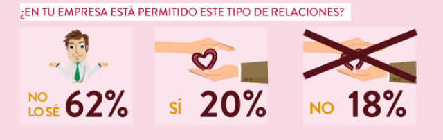 ¿Existen empresas en las que se prohíben las relaciones de amor entre sus empleados? Según los resultados de la encuesta, el 18% de los usuarios aseguran que en la suya sí está prohibido pero, el dato más llamativo, es que el 62% de los participantes desconocen las normas corporativas al respecto.