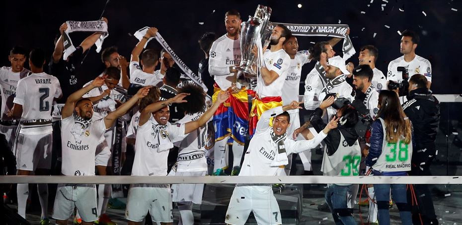 Uno a uno fueron cruzando la pasarela hacia el centro del césped todos los jugadores. Especial recibimiento fue el de Arbeloa, con la camiseta de Cheryshev, Cristiano Ronaldo, Pepe, Marcelo y un Sergio Ramos que fue el encargado de portar la 'orejona'. Con todos ya en el campo, el "campeones, campeones" se adueñó del Bernabéu para dar paso después al himno de la décima.