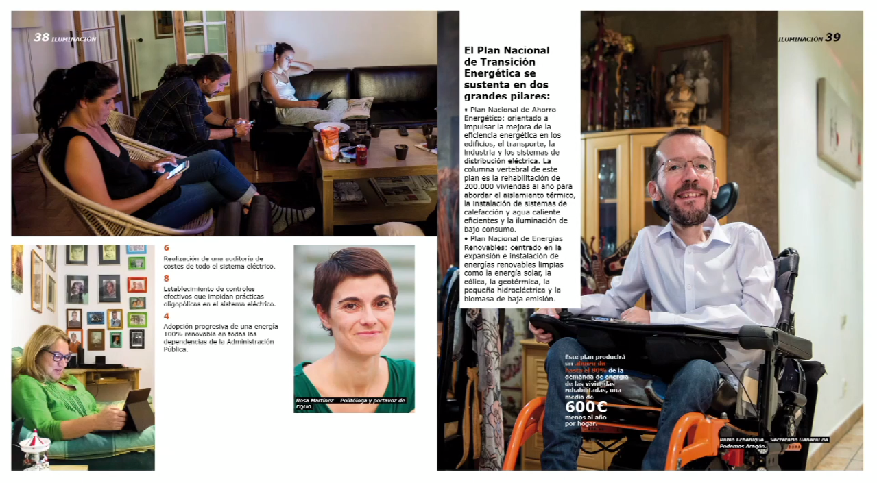 En la sección de iluminación, Podemos recoge las medidas con las que quieren "iluminar la política con un nuevo modo de entenderla" y en ella hacen énfasis, por ejemplo, en su Plan Nacional de Transición Energética, la igualdad o la conciliación de la vida familiar y laboral.
