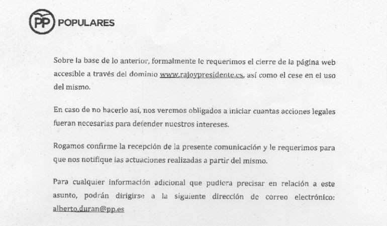 El PP ha enviado un requerimiento al titular de la web ' rajoypresidente.com' para que la cierre y deje de utilizar este dominio. Los contenidos de dicha página son de humor y hacen bromas tanto del presidente del Gobierno como del resto del partido. El PP entiende que "causa confusión" y advierte de que si no se atiende su exigencia, emprenderá acciones legales.