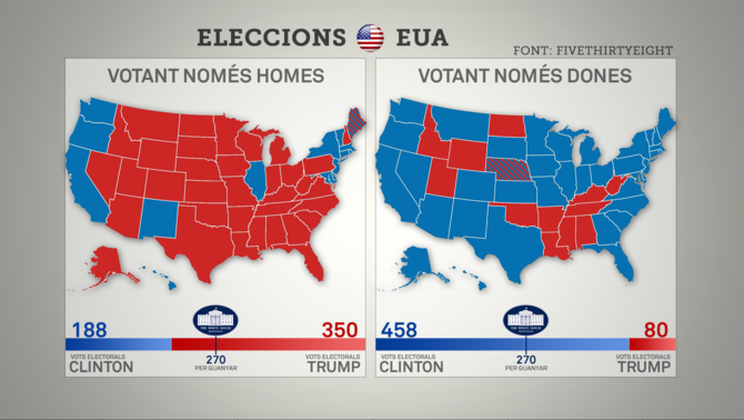 La web de análisis estadounidense 538 ha analizado la intención de voto tanto de hombres como mujeres al hacerse las siguientes preguntas: ¿Qué pasaría si en las próximas elecciones sólo votaran los hombres? ¿Y si lo hicieran solo las mujeres?