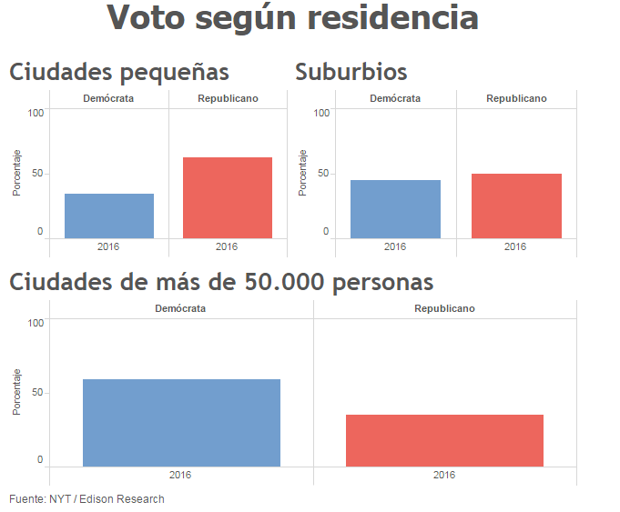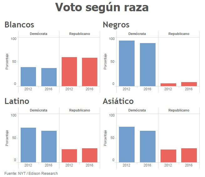 Con los siguientes gráficos, podremos hacer nos una idea aproximada de la victoria de Trump y ver quién ha votado a quién.