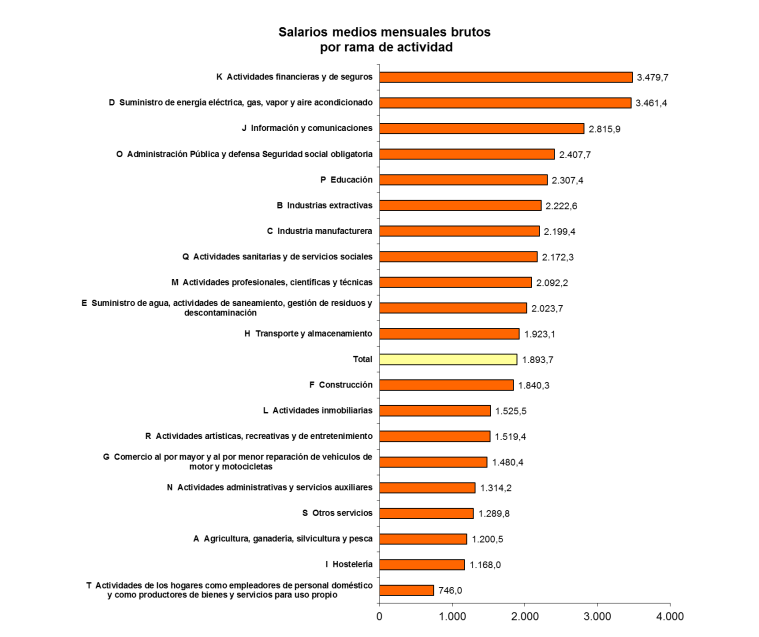 Los salarios medios más altos en 2015 se dieron en las actividades de los hogares como empleadores de personal doméstico (746 euros brutos mensuales), en hostelería (1.168 euros) y en la agricultura (1.200, 5 euros), y los más altos correspondieron a las actividades financieras y de seguros (3.479,7 euros brutos al mes), suministro de energía eléctrica (3.461,4 euros) e información y comunicaciones (2.815,9 euros).