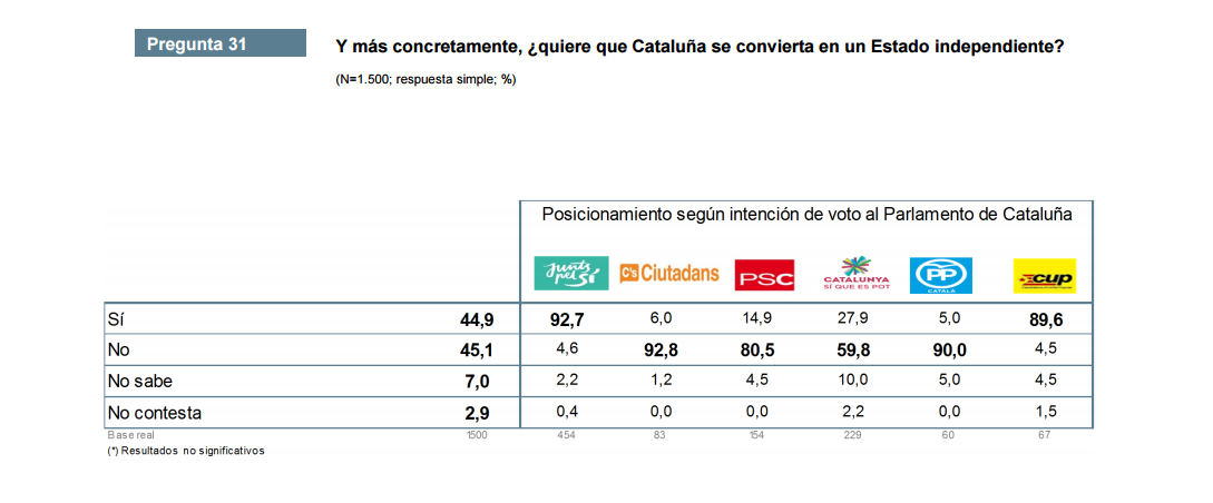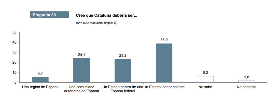Si atendemos a la pregunta ‘cree que Cataluña debería ser…’, la distancia es aún mayor: el 53% estaría en contra de la independencia, frente a un 38,9, un 6,3% que no sabe y un 1,8 que no contesta.