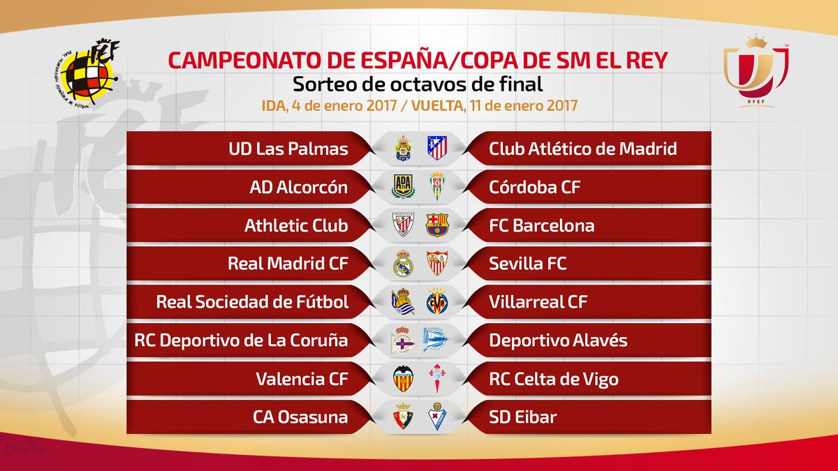 Además, el Atlético de Madrid se cruzará ante la UD Las Palmas, mientras que los dos equipos de LaLiga 1,2,3, el Alcorcón y el Córdoba, quedaron emparejados entre sí por lo que un representante de la División de Plata estará en cuartos. Las eliminatorias se disputarán, la ida, los días 3, 4 y 5 de enero, y la una semana después la vuelta.