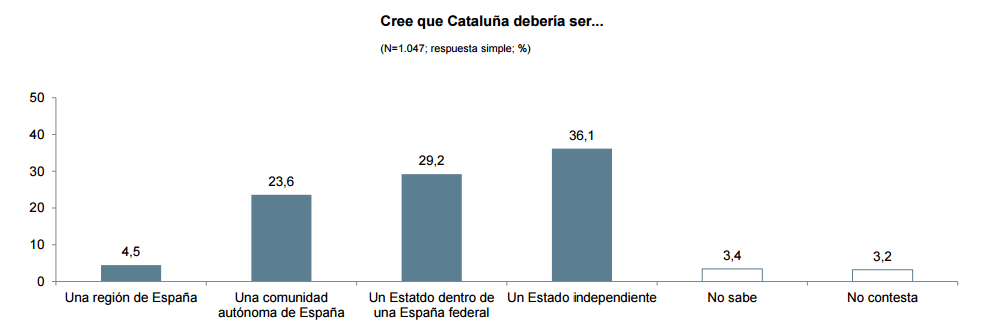 De hecho, sólo el 36,1% de los catalanes quiere que Catalunya se convierta en un Estado independiente. El resto, el 63,% se decanta por otras formas de organización territorial como se puede observar en el siguiente gráfico: