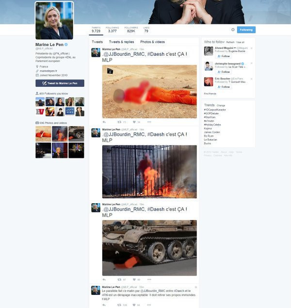 El Parlamento europeo ha decidido retirarle su inmunidad para este caso a petición de Francia, que la investiga por haber publicado en las redes sociales fotografías de ejecuciones de la organización terrorista Daesh. Esta medida permite a la justicia francesa obligarla a comparecer en plena campaña hacia el Elíseo.