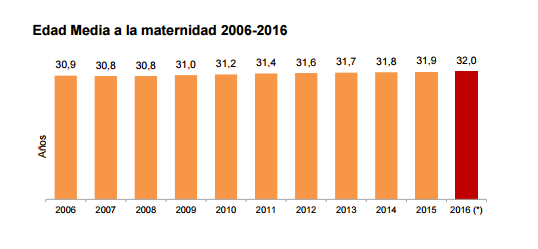 La edad media para ser madre asciende de nuevo y se sitúa en los 32 años. En términos medios, las madres españolas (32,5 años) tuvieron sus hijos tres años más tarde que las extranjeras (29,6 años).