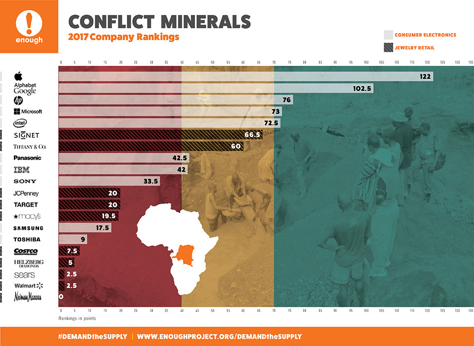 El proyecto The Enough Project califica a Apple como un "claro líder" y señala que "destinó recursos sustanciales al desarrollo de procesos para la obtención de minerales de minas que benefician a las comunidades congoleñas".